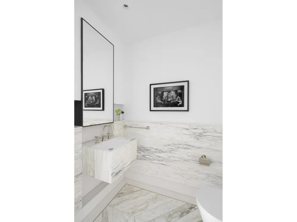 A dramatic powder room welcomes guests with Calacatta Paonazzo marble floors and a sculptural monolithic vanity. Additional highlights include a premium stacked washer/dryer and a Kraus Hi-Tech system that allows full voice and remote control of climate, lighting, motorized shades, sound, and connectivity.