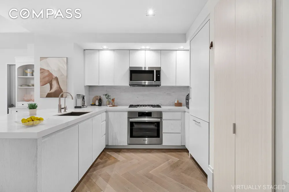 The residence features a living space that exude a tone of subtle luxury, greeting you with bespoke entry and interior doors with inset panels, new oversized casement windows, wide-plank herringbone floors, 11-inch baseboards, and 9 foot 6 inch plus beamed ceilings. The sleek, modern kitchen is a culinary enthusiast's dream, featuring finely crafted white oak wood finished cabinetry, honed marble countertops, and a full suite of Bosch appliances with custom millwork paneling.