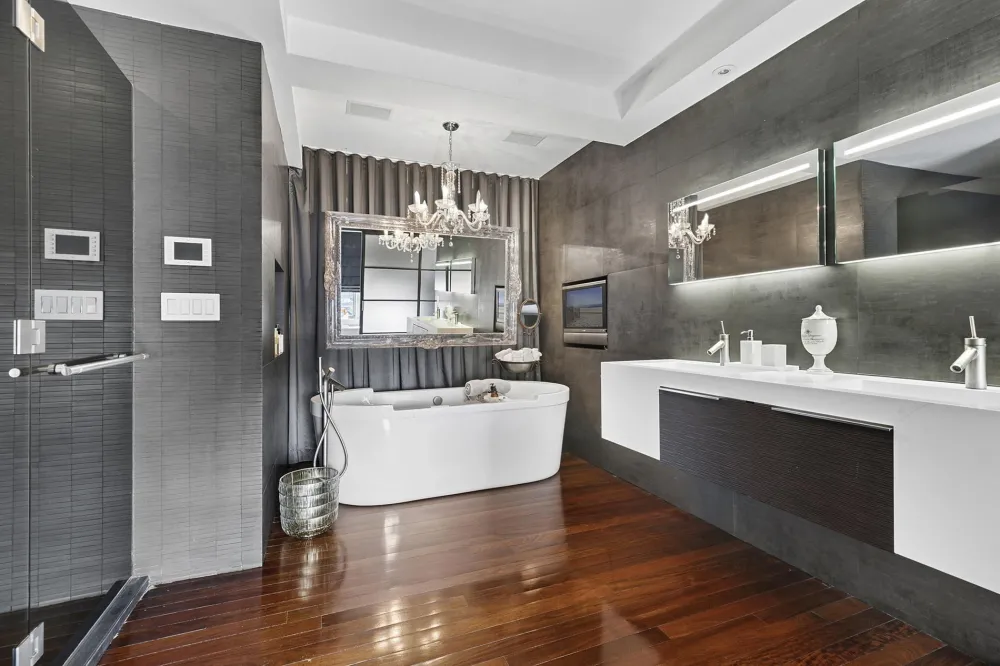 Designed for modern living, this home includes Crestron smart home controls, automated shades, zoned central air, built-in speakers, recessed lighting, and updated systems throughout — including all-new HVAC, windows, plumbing, and electrical. The residence enjoys four exposures, bathing every room in natural light.