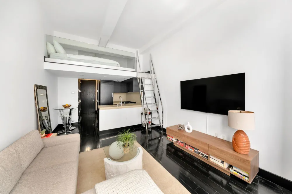 BRAND NEW TO MARKET : This gorgeous, modern and stylish condominium home offers both elegance and convenience. The apartment features soaring 11ft ceilings and two oversized windows affording amazing light and great landmark building views. Open kitchen has top of the line appliances including fully integrated fridge and four-burners stove, as well as bar-like seating. Sleeping area is lofted, accessed by sleek chrome stairs. Multiple closets and washer and dryer are in the entrance hall which also leads to a spacious designer's bathroom. There is a capital assessment of $578.05 per month until December 31, 2025.