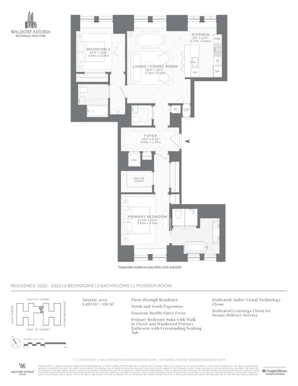 The primary bedroom has a large walk-in closet. The windowed five- fixtured bathroom features floor-to-ceiling honed white Bianca Carrara marble slab walls and radiant heated custom designed mosaic marble tile floor. A custom double vanity with polished Luna Gray marble countertop, elegant stainless-steel legs, and integrated lighting provides exceptional storage complementing the cabinet with integrated lighting, mirror and concealed electric outlet. The freestanding custom designed deep soaking tub offers a thoughtful shelf and sits below a large custom wall mirror featuring fixtures and fittings that are custom forged in polished nickel, exclusively for Waldorf Astoria Residences.