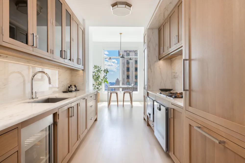 - Kitchen with Bilotta rift-cut oak cabinetry, Colorado White marble countertops, and Gaggenau appliances