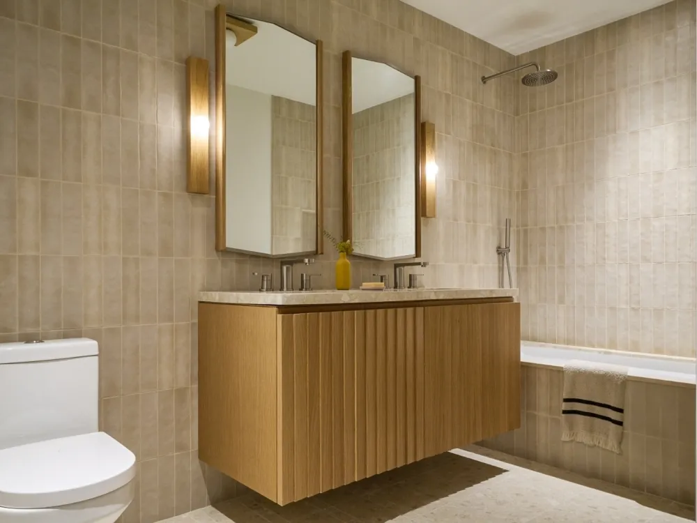 The bathrooms at Bergen are outfitted with soft tones and warm wood accents that make for a spa-like oasis with materials that are crafted to last. The five-piece primary suite is adorned with honed Crema Vanilla marble wall and floor tiles, a custom white oak vanity with Crema Vanilla marble countertop, legs and ledge, a soaking tub clad in honed Crema Vanilla marble at the deck and skirt and a separate glass enclosed shower and water closet. Finishing touches include radiant heated floors and custom light fixtures by Workstead. The four-piece secondary bathroom is functional and formal and features a custom white oak vanity topped with a honed Agglo terrazzo countertop, matte Tatami-Beige wall tiles and honed Agglo terrazzo floor tiles. Custom designed light fixtures by Workstead complete these jewel boxes. The powder room is intimate and elegant, presented in a two-tone palette of Crema Vanilla marble and white oak with a grand custom carved pedestal sink in Crema Vanilla marble. Subtle touches include wall-mounted fixtures, and a custom Workstead designed wall sconce.