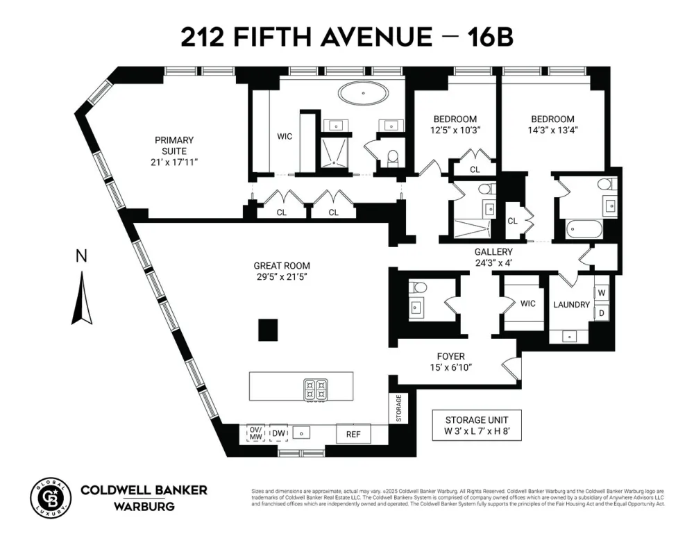 The voluminous owners suite boasts one of the most striking, spa-inspired baths in New York City. The living space offers remarkable volume afforded by 11-foot 2-inch ceilings and unobstructed lines. The grand kitchen is a beautiful assemblage of marble and wood, purposefully designed and scaled to accommodate and service the capacity of the sprawling entertaining area. Large windows frame the iconic Flatiron Building and captivate Neo-gothic details of the surrounding architecture.