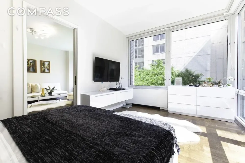 The corner primary bedroom, bathed in radiant eastern light, offers a dual exposure with vistas of a meticulously landscaped courtyard adorned with fountains and verdant greenery. Bespoke California Closets line the residence, leading to an expansive, marble-clad bathroom featuring a luxurious soaking tub, naturally illuminated yet cocooned in intimate privacy. A private storage unit is included for added convenience. Electronic blinds throughout the apartment.