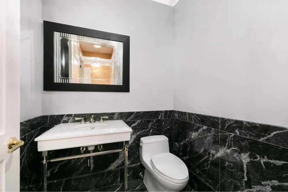 The spacious living and dining area features pristine hardwood floors and classic architectural details, while the sleek kitchen is outfitted with custom cabinetry and rich green marble countertops. The large primary suite offers exceptional comfort, complete with generous closet space and a luxurious marble bath. A stylish powder room and in-unit washer/dryer round out the layout.