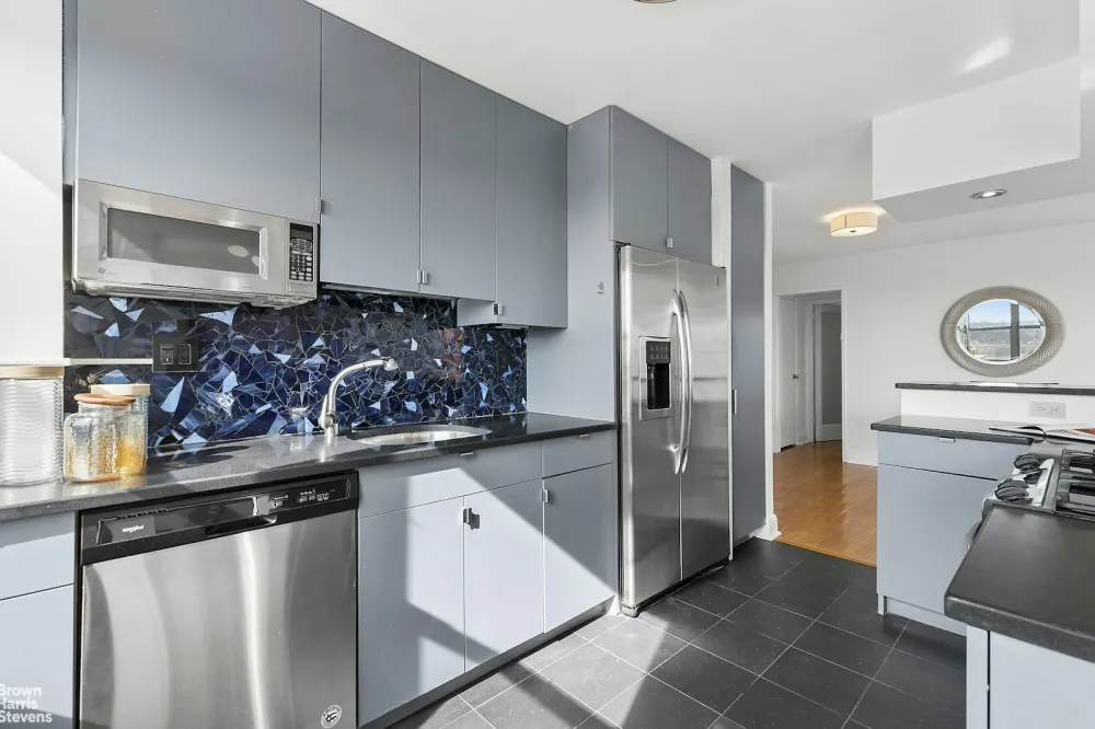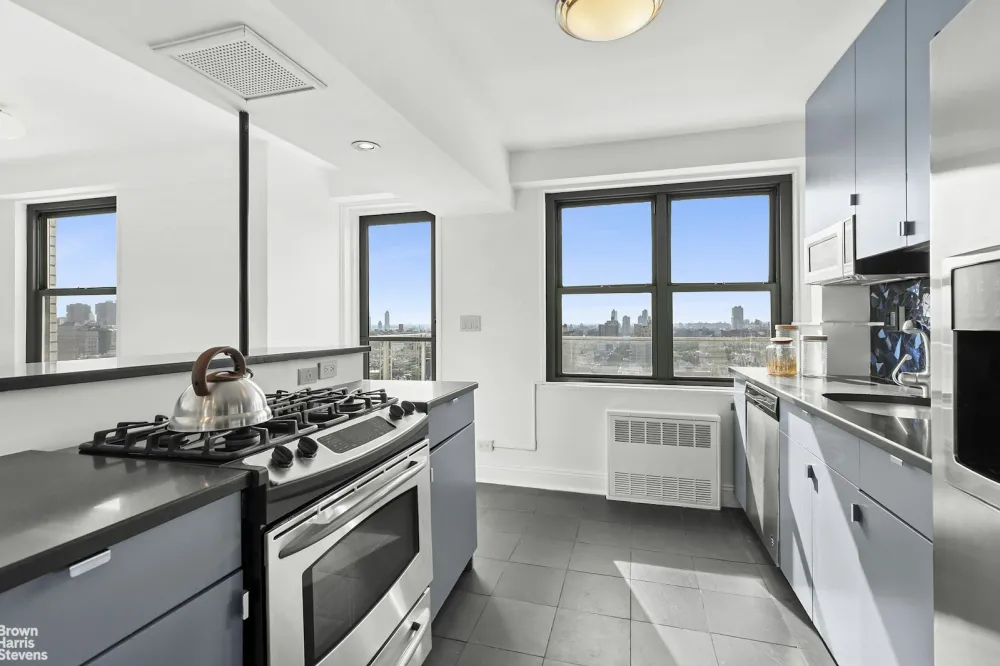 The expansive windowed open kitchen is the heart of the home, completely re-imagined creating an inviting space for casual meals and gathering on the corner breakfast bar countertop with stainless steel appliances and pantry. Savor the al fresco lifestyle and ever-changing skyline colors on the first balcony accessed off the living room for dazzling outdoor dining and relaxing.