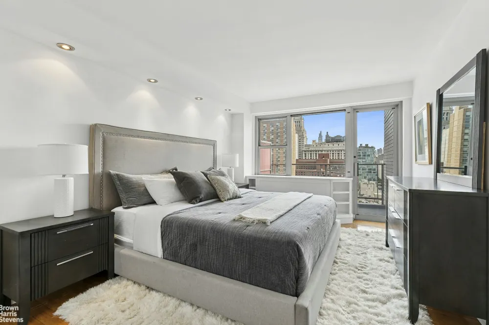 The king-sized primary suite is conveniently private from the living space, highlighted by its own outdoor terrace showcasing stunning nighttime views of Manhattan's landmark buildings. The bedroom is complete with a plethora of closet space along the wall and an en suite bath with stone tile, pedestal sink and soaking tub to add to the retreat-like feel.