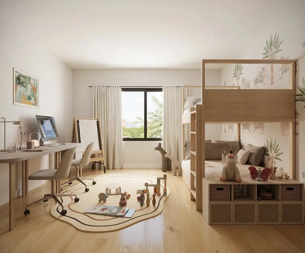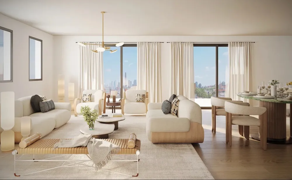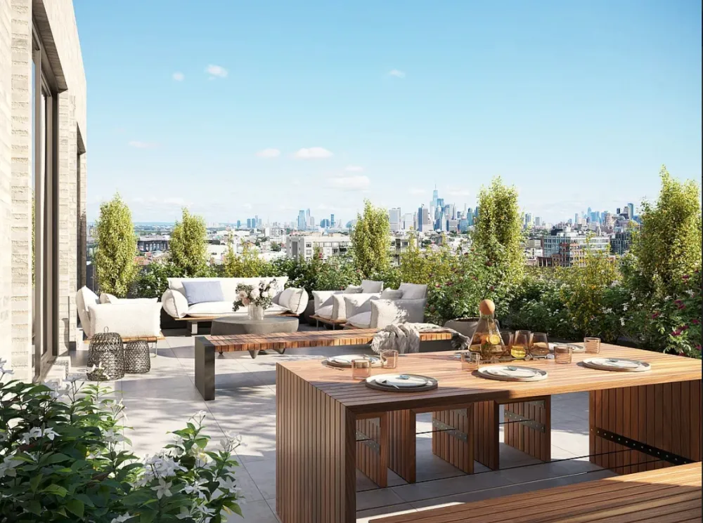 Introducing Residence PH1, a stunning penthouse at The Ainsley that spans 1,413 square feet of interior space with expansive private terraces offering breathtaking views. This 2-bedroom, 2-bathroom home embodies the pinnacle of luxury living, with meticulously curated finishes and spacious layouts that cater to a refined lifestyle. The open-plan living and dining area is framed by floor-to-ceiling windows, allowing sunlight to flood the space while providing direct access to a large terrace perfect for outdoor dining, lounging, or entertaining. The kitchen is designed for the modern gourmet, with custom Scavolini cabinetry imported from Italy, Taj Mahal quartzite countertops and backsplash, Ilve Majestic induction range in white with brass trims imported from Italy, and a suite of integrated appliances including a panel-ready refrigerator and dishwasher. The sleek, contemporary design of the kitchen pairs beautifully with the natural light and open layout of the home. The king-sized primary bedroom features access to an oversized balcony, a walk-in closet and a luxurious en-suite bathroom with chrome fixtures, luxurious Vive tiles imported from Spain, and a glass-enclosed walk-in shower. The secondary bedroom offers flexibility for a home office, guest accommodations, or family use. The second bathroom is equally well-appointed, featuring high-end finishes and ample storage. A full-size washer/dryer is discreetly tucked away, adding to the home’s practicality. The Ainsley offers an unmatched living experience with over 10,000 square feet of amenities, including a fitness center, residents’ lounge, children’s playroom, and a rooftop terrace with panoramic views. Located in the heart of Park Slope, The Ainsley is steps from Prospect Park, boutique shops, and some of the city’s finest restaurants. With nearby subway access, commuting to Manhattan is seamless, making this penthouse the perfect combination of luxury and convenience.