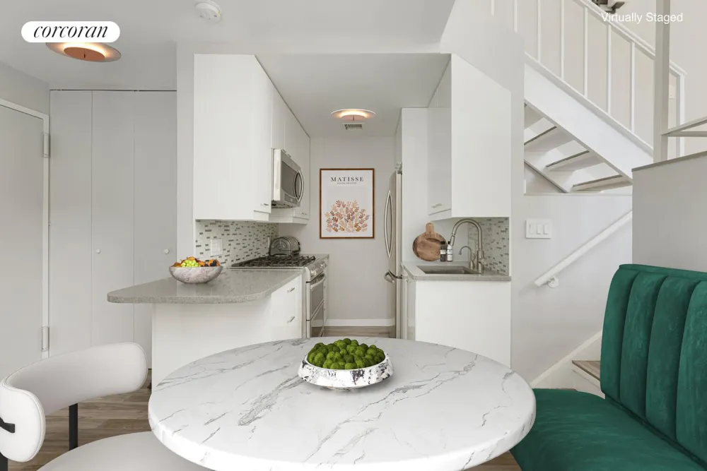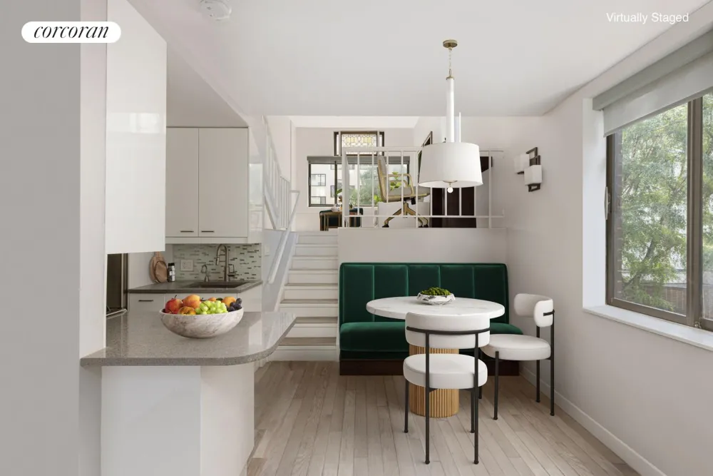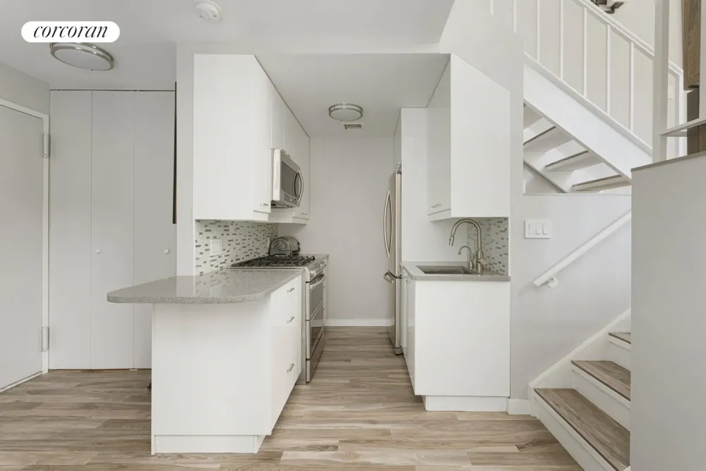 Upon entering, you are welcomed by a spacious foyer and galley style kitchen featuring Samsung stainless steel appliances, including a smart oven. A tile backsplash, garbage disposal, and granite countertop complete the space making it as practical as it is polished. Tile flooring adds durability and a modern aesthetic to every level while elegant sconce lighting brings warmth to the adjacent dining area with its views of Bleecker Street. This level includes generous storage and a full bathroom with a space-saving pocket door.