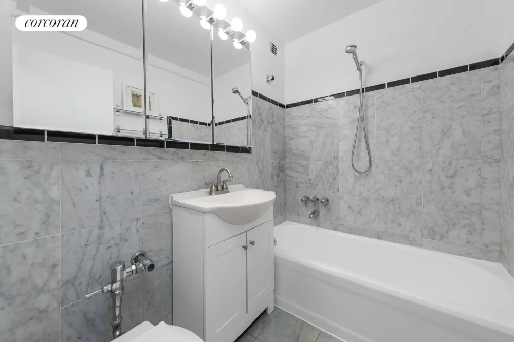 Indulge in a bit of luxury in the renovated bathroom, complete with an oversized tub-optimal for unwinding after a bustling day in the city.