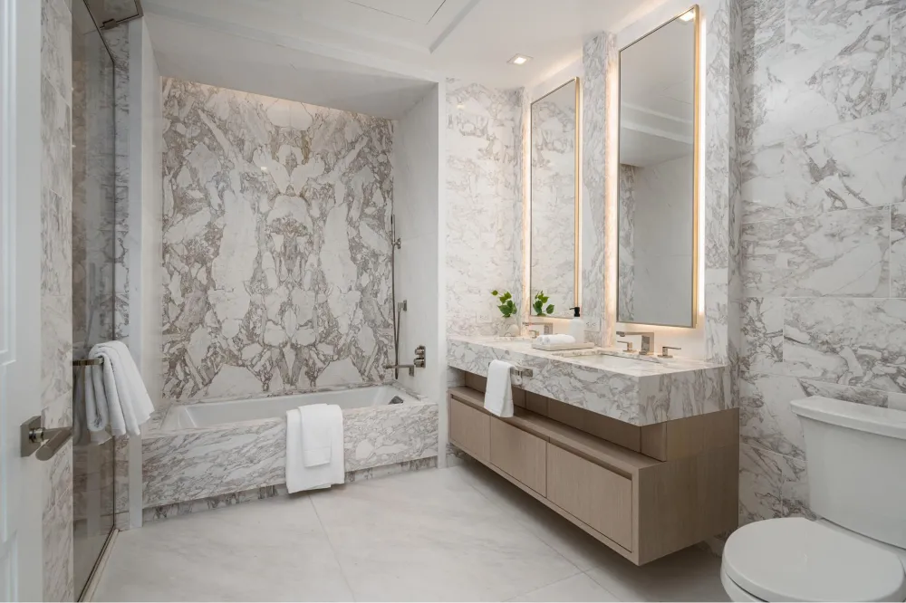The corner primary bedroom features an expansive walk-in closet and en-suite primary bath. The serene primary bath offers Bianco Dolomiti radiant heated flooring underfoot, an enclosed shower, and a separate Kohler tub with Marno Illusion marble details. A custom vanity with white oak, rift-cut wood veneer millwork, and Marno Illusion countertops is completed with a built-in medicine cabinet, Kallista Sink and Dornbracht Fixtures. A unique powder room features a dramatically veined Nero Maquina vanity countertop, ebony stained oak quarter cut wood veneer vanity and Nero Maquina floors. An eye-catching Cobalt Flash marble wet wall, Dornbracht fixtures and a Kohler Corbelle toilet offers a striking contrast against the dark woods and stones. A Nest Learning Thermostat and Bosch washer and dryer complete this elegant residence.