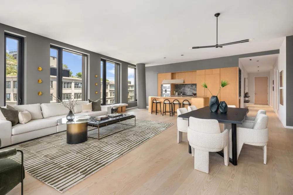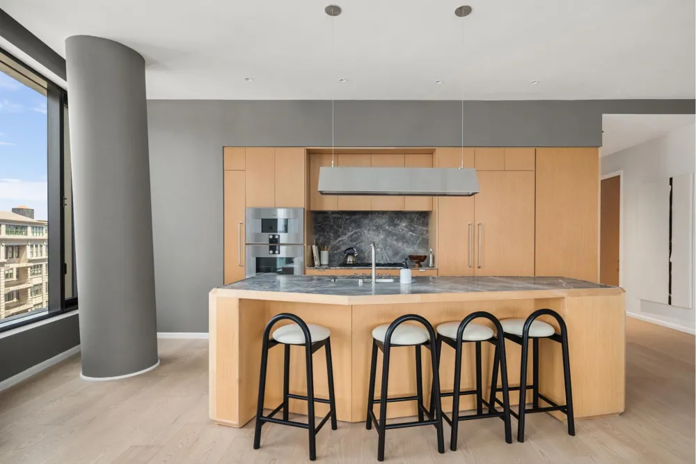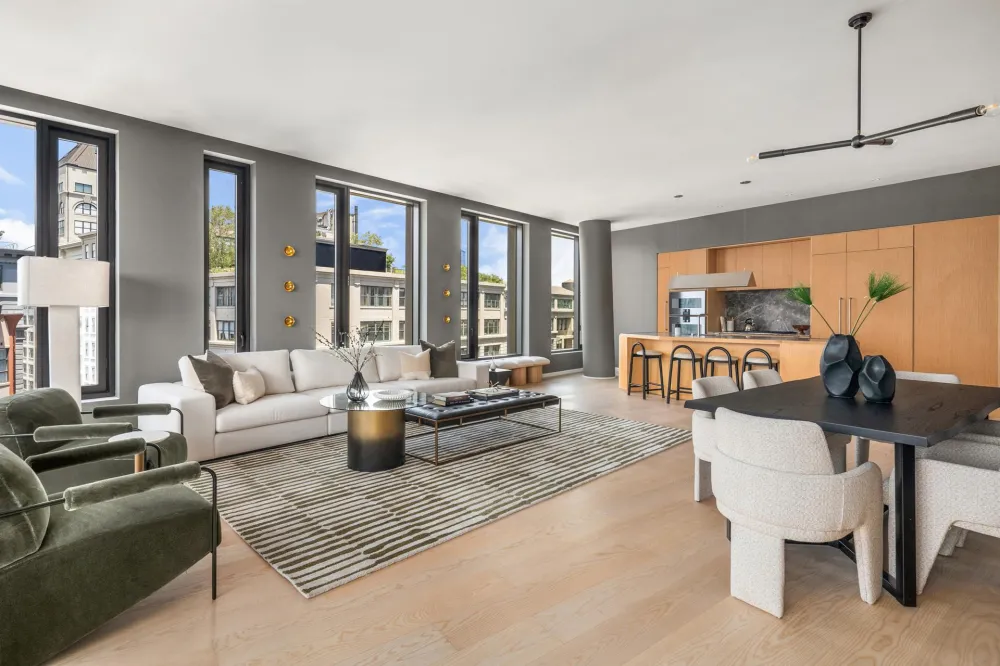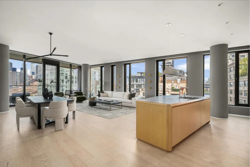 The formal foyer and gracious gallery lend way to the light-filled great room, defined by meticulous attention to detail throughout. The Workstead-designed kitchen merges refined details with rich materials. Featuring a statement island with inlaid Fior di Bosco stone slab and chamfered edges, raked maple cabinetry paired with satin nickel hardware and Gaggenau appliances, the kitchen comprises an integral part of the open living and dining area. The great room boasts floor-to-ceiling windows, providing an unbeatable views across the private terrace of the Brooklyn Bridge. A wet bar featuring maple cabinetry, Fior di Bosco backsplash, stainless sink and Thermador wine cooler make for the ideal entertaining space.