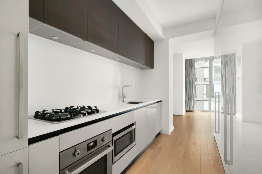 Bathed in natural southern light through floor-to-ceiling windows, this sophisticated home features wide-plank white oak flooring and a modern open layout. The sleek, state-of-the-art kitchen is equipped with Silverstone quartz countertops, imported Italian cabinetry, a Bertazzoni gas range and oven, integrated Liebherr refrigerator, and ultra-quiet dishwasher.