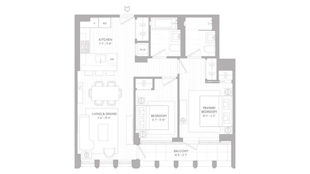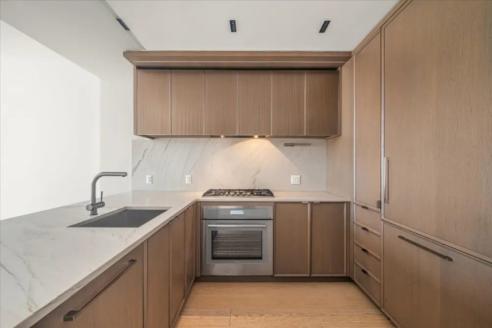 The open-concept living and dining area is ideal for entertaining, with room for a full dining table and easy access to the terrace. The adjacent open kitchen offers custom white oak & fluted champagne glass cabinets and Luca de Luna quartzite countertops & backslash, supported by a suite of Thermador Masterpiece Series appliances including 30" five-burner gas cooktop, 30" oven with integrated wifi capacity for smartphone-control capability, and a fully-integrated dishwasher. The serene primary suite offers terrace access as well, two generous closets, and a spa-inspired ensuite bath featuring elegant fixtures and finishes including a custom, fluted White Oak floating vanity, pleated marble shower walls, cove lighting, and brushed pewter fixtures. The secondary bedroom is equally well-appointed, with excellent closet space and natural light and an adjacent second full-bath with a custom fluted White Oak floating vanity as well. Additional conveniences include an in-unit vented washer and dryer, oversized windows, independent thermostatic controls for each room, and ample storage throughout.