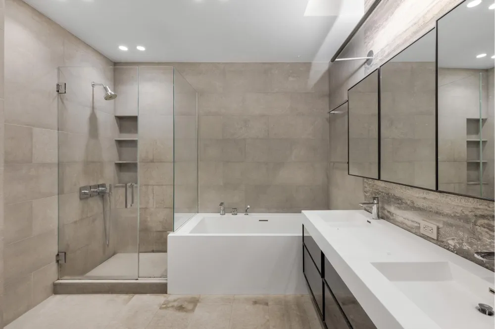 The modern kitchen is equipped with custom European oak cabinetry, a polished Glassos slab countertop, an antique grey marble slab backsplash, Dornbracht fixtures, and high-end appliances, including a Bertazzoni oven and cooktop, alongside Sub-Zero refrigerator, freezer, and wine cooler. The master suite includes a walk-in closet and a luxurious double sink bathroom with French limestone flooring and wall tiles, travertine slab backsplash, NuHeat radiant heated floors, and a WetStyle Cube Collection deep soaking tub. Additional bathroom features include smoked oak vanity millwork, an LED-illuminated medicine cabinet with a mirror defogger, and Philippe Starck-designed Hansgrohe fixtures.