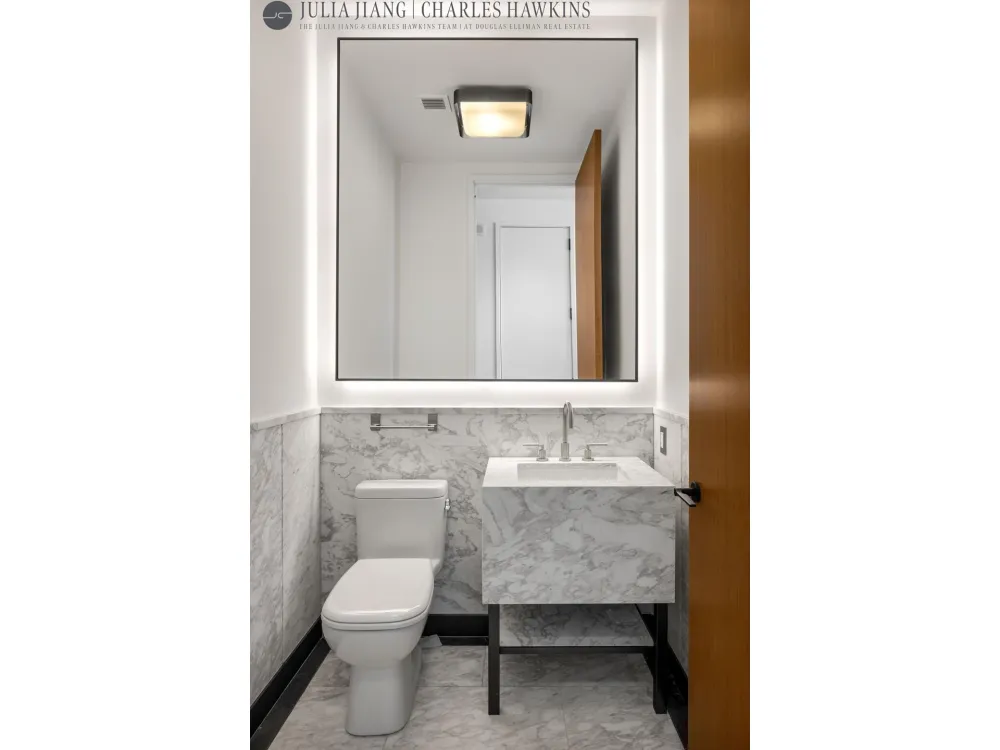The oversized primary suite is a serene retreat, featuring floor-to-ceiling windows with unobstructed eastern river and city views. It easily accommodates a king-sized bed, with ample space for artwork and a dresser. The spa-like en-suite bath is clad in elegant Bianco Dolomiti marble and includes a large walk-in rainfall shower, heated floors, platinum fixtures, and generous storage.