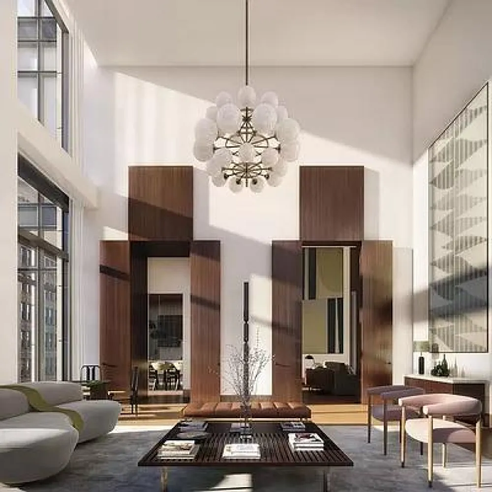 Perched high above NoMad, this sun-drenched corner unit features dramatic 11-foot floor-to-ceiling windows that frame panoramic skyline views to the North and East, including sweeping vistas of the East River.