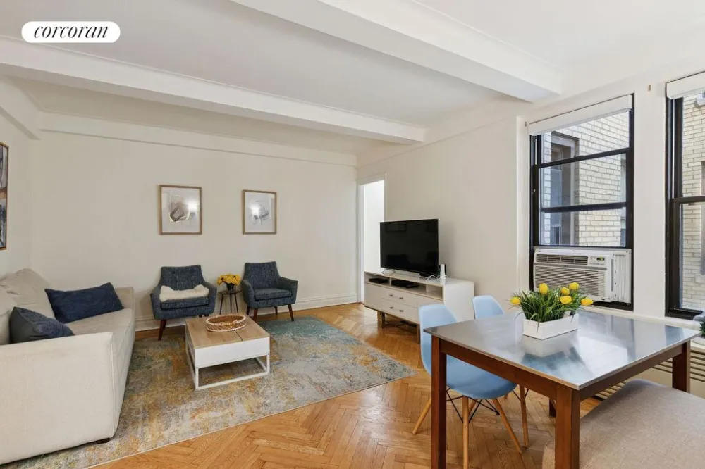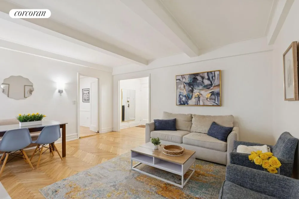 Enter through a gracious foyer featuring a custom walk-in closet, leading into a spacious living and dining area that immediately welcomes you with warmth and elegance. Continuing on you will notice classic prewar details including stunning herringbone oak hardwood floors, high beamed ceilings, and baseboard moldings which enhance the home's timeless character.