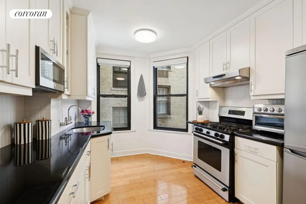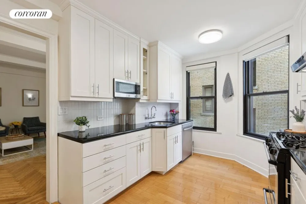 Just off the living space is the large, windowed eat-in kitchen which is outfitted with modern stainless steel appliances including a Bosch dishwasher, LG refrigerator, and GE oven. Additionally you will find abundant cabinet storage above and below. A perfect blend of functionality and charm.