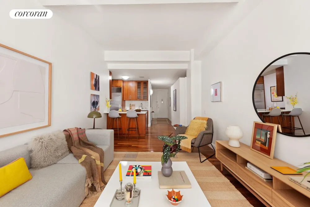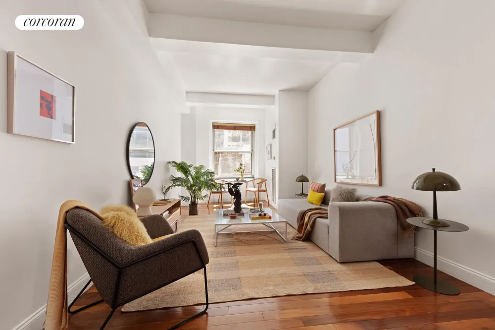 This thoughtfully designed 2-room residence offers approximately 620 square feet of smartly laid-out space. A wall separates the sleeping area from the main living space, providing added privacy and flexibility in layout. East-facing windows invite in abundant natural light, highlighting the high ceilings and rich hardwood floors throughout.