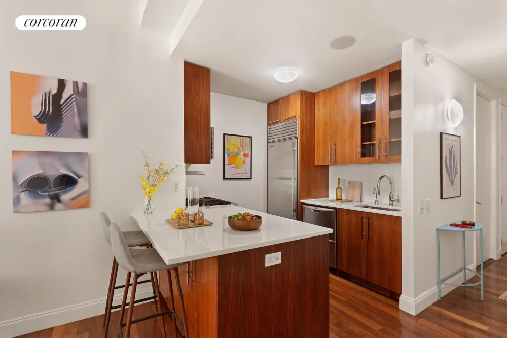 The open kitchen is outfitted with sleek cabinetry, a high-end dishwasher, and premium finishes that support both daily living and entertaining. The marble bathroom includes an oversized soaking tub, and a walk-in closet adds generous storage.