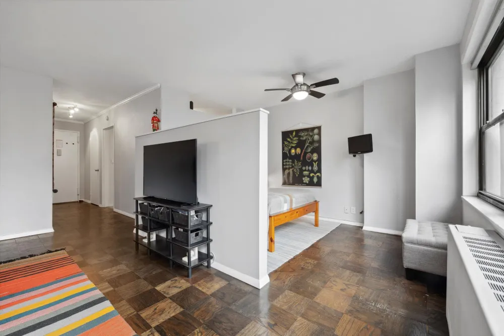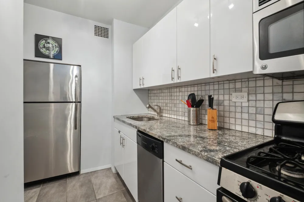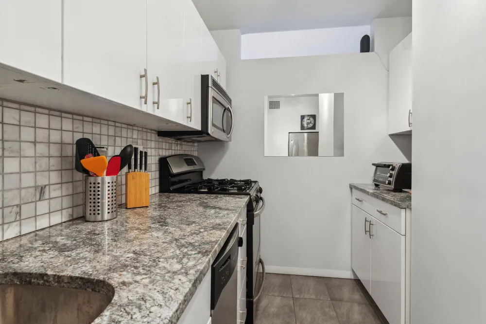 You will fall in love with this tastefully renovated studio apartment. An entryway leads to a spacious west-facing living space with oversized windows and tree-top views. The studio's layout has been changed, and the new design separates the bedroom area and the living space while maintaining an open feel of this beautiful home. Enjoy cooking in the renovated kitchen with stainless steel appliances, abundant cabinet and counter space, and a tiled backsplash. The large entry closet could serve as a pantry, coat closet, and utility storage. The updated bathroom with classic white subway tiles is tucked away and separated from the main living area by a hallway and an oversized closet with custom shelving. Thoughtfully designed and generously sized, this special home offers a perfect balance of comfort and functionality.
