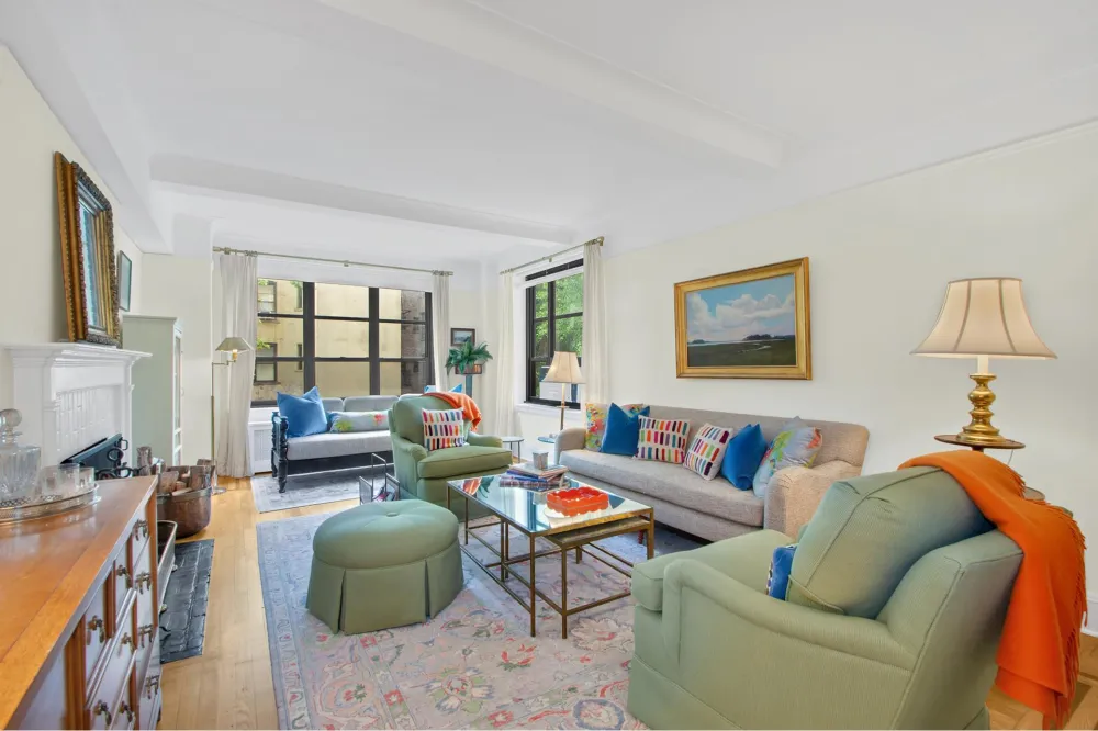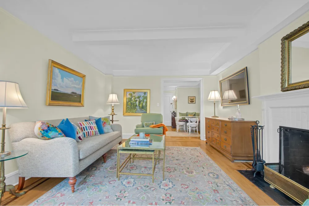 The gracious living room with a wood-burning fireplace and dual exposure overlooking the lush garden offers ample space for a formal living room and additional seating or desk area.