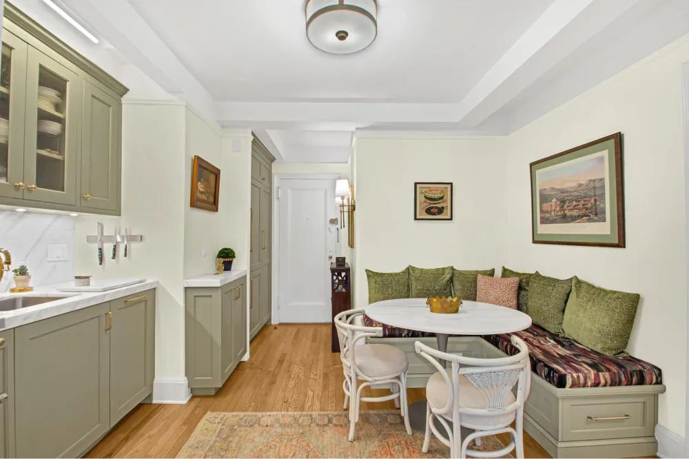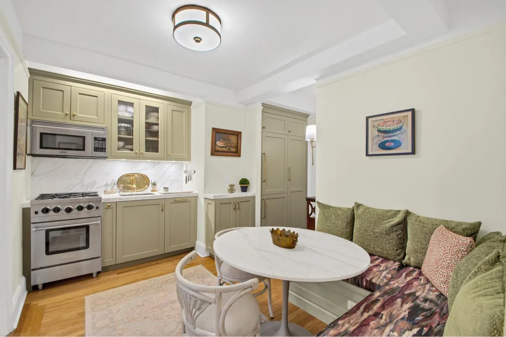 The eat-in-kitchen has been renovated to the highest standard, inclusive of custom cabinetry with a matching banquette by Rutt, solid slab Carrera marble counters and backsplash with a matching table from Atlas Stone Fabricators, a one-of-kind kitchen faucet by Newport Brass, a 4 burner Blue Star Culinary range, Viking Convection Oven and Microwave, and a Bosch Dishwasher and Refrigerator. The custom banquet is not only a welcoming place for your morning coffee or intimate dinner parties, but it also provides additional in-seat storage and electrical outlets.