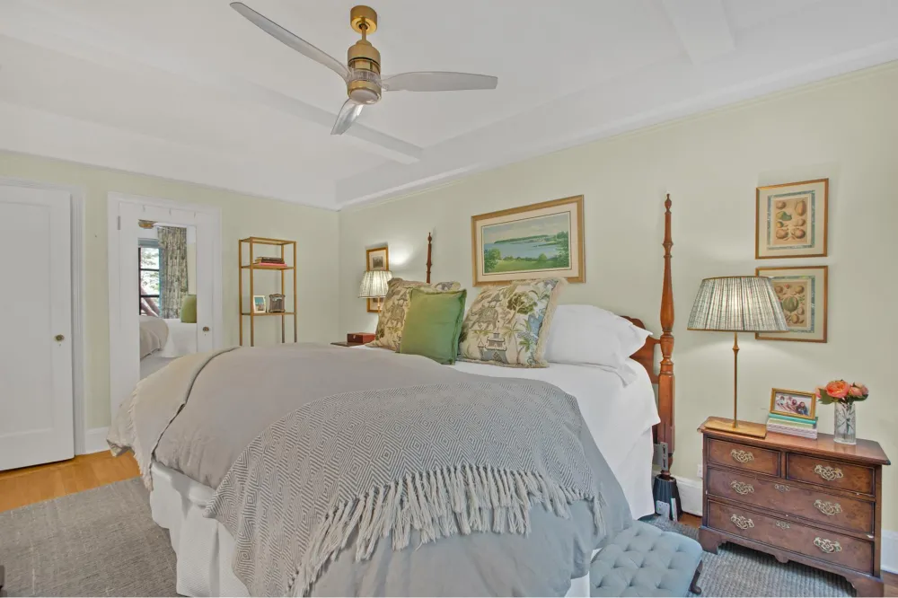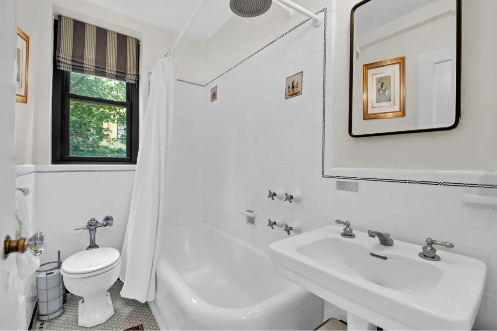 The tranquil and spacious bedroom has a modern ceiling fan, two closets and can easily fit a King sized bed with full-sized furniture. The windowed bath has been carefully restored to maintain the original prewar detail such as the porcelain tiles and cast iron soaking tub with shower.