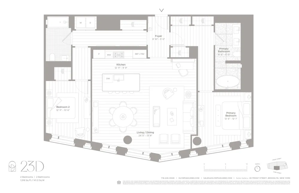 Offering views of the New York Harbor and Downtown Brooklyn, Residence 23D is the definition of reimagined luxury in the heart of Dumbo. This two-bedroom, two-bathroom residence with 1,518 SF of interior space is imbued with a timeless yet modern beauty.
