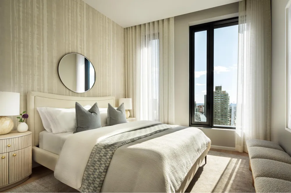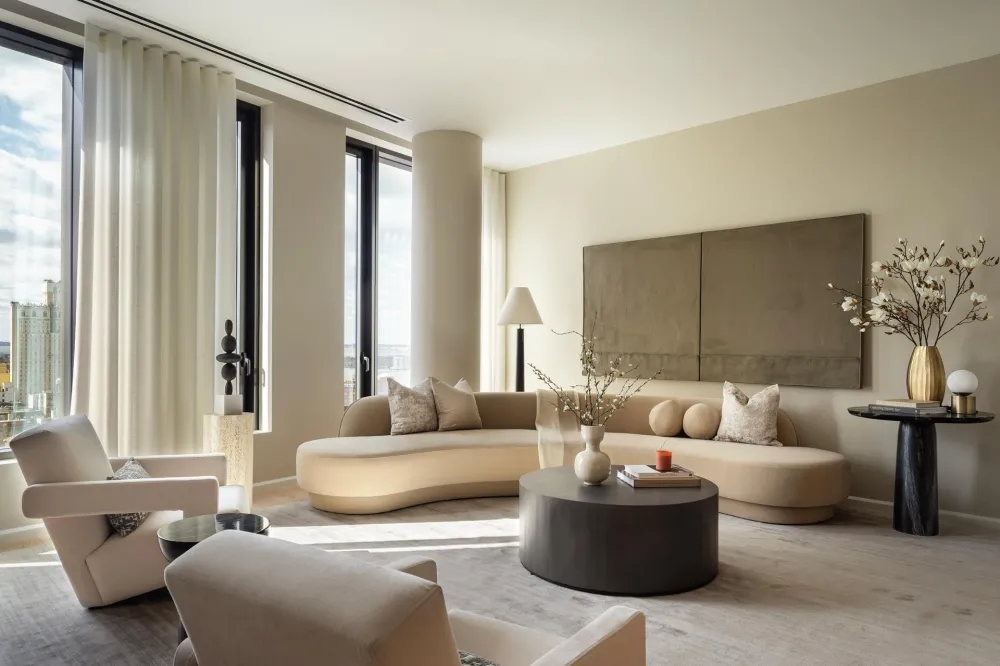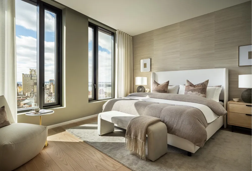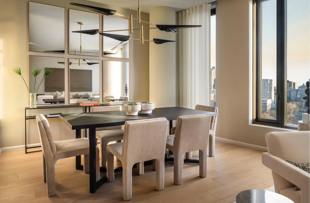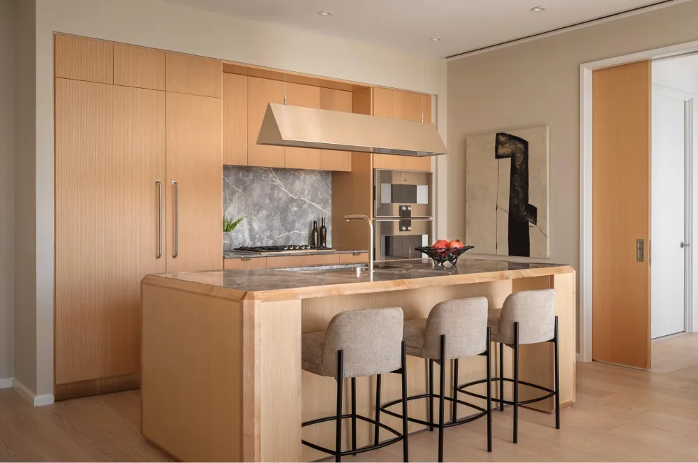 The centrally located foyer provides discrete entrance hallways to each of the bedroom suites and the central open plan living/dining area. The Workstead-designed kitchen merges exquisite detail with rich materials and features a statement island with inlaid Fior di Bosco stone slab and chamfered edges, raked maple cabinetry paired with satin nickel hardware and Gaggenau appliances.