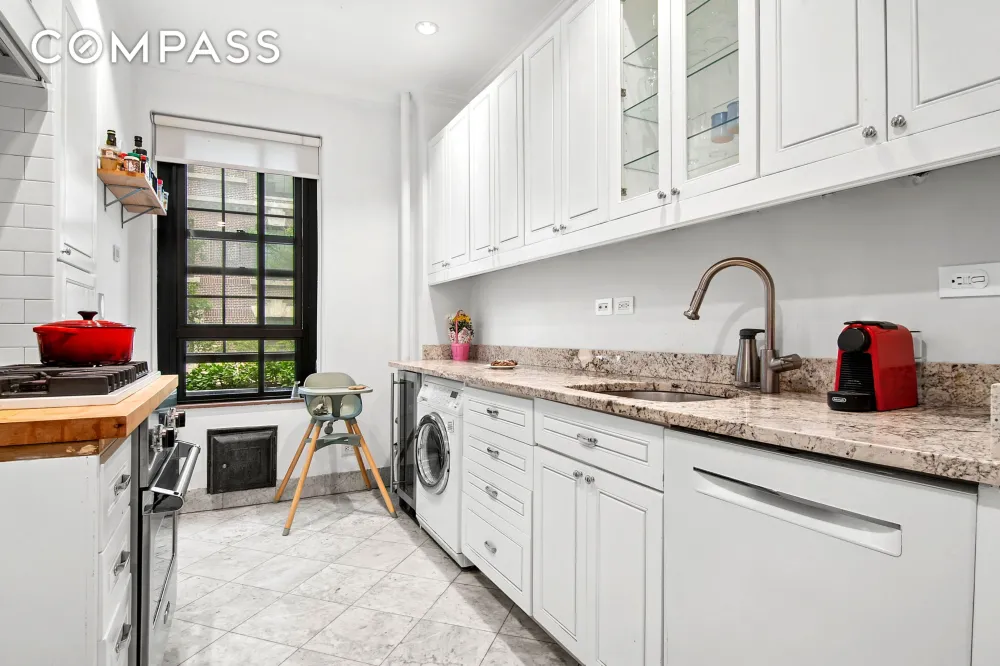 Throughout the home, original parquet floors have been newly refinished, and classic wall moldings maintain the apartment’s timeless character. Carefully curated updates include modern ceiling fans, designer light fixtures, and a fully renovated kitchen and bathroom. The kitchen offers a clean, contemporary aesthetic with updated appliances, while the bathroom is a stylish blend of vintage and modern, featuring sleek finishes and the original soaking tub — a charming nod to the building’s storied past.