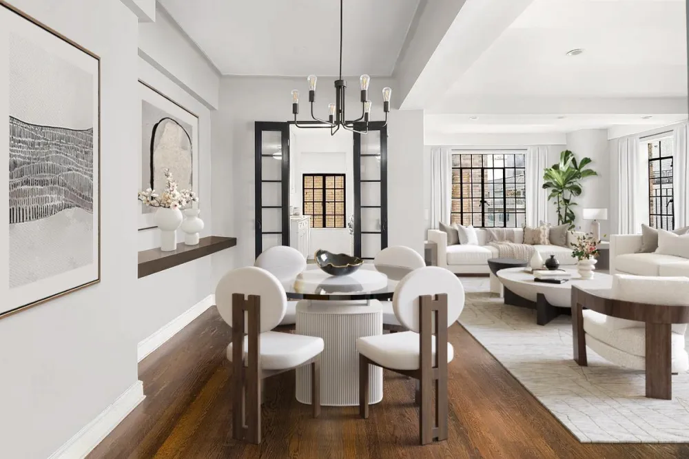 Masterfully configured as a three bedroom, two and a half bathroom home plus dining alcove, the third bedroom can easily be used as an office or den when opening the set of french doors directly off of the living room.