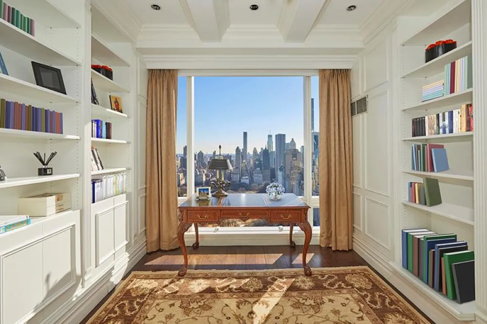 The primary bedroom is a serene and spacious retreat with captivating, ever-changing views of Central Park. It includes a striking walk-in closet featuring custom oak cabinetry, and a luxurious five-fixture en-suite bathroom clad in Gaudi marble and Biancone stone.