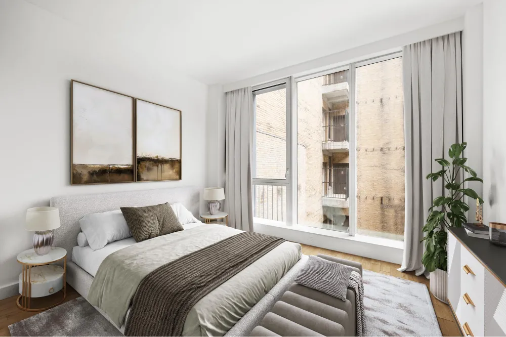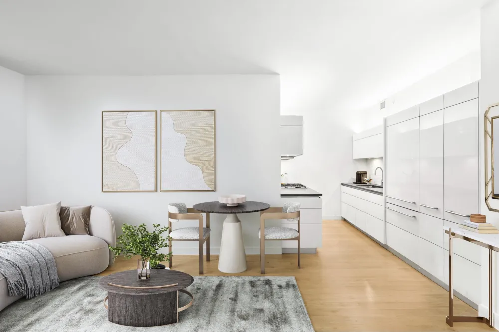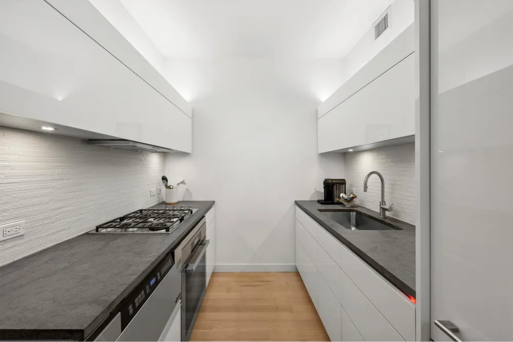 Inside? Space to breathe. 5C is the largest one-bedroom layout in the building-sleek, modern, and move-in ready. Think: soaring ceilings, floor-to-ceiling windows, and natural light that hits just right for your morning matcha and golden-hour selfies. The open chef's kitchen is outfitted with top-of-the-line Miele appliances and is made for hosting: dinner parties, wine nights, or a next-day bagel brunch.