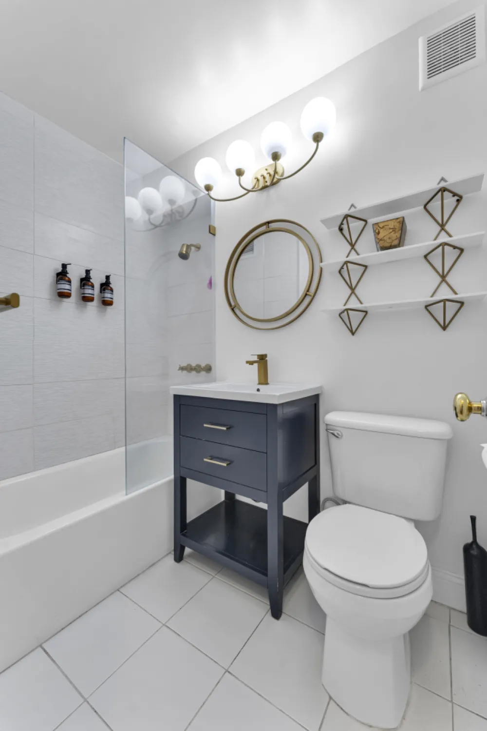 Step into a spa-quality bathroom that's been beautifully renovated with sophisticated modern finishes, including a deep soaking tub, elegant vanity with brass accents, geometric shelving, and crisp tilework, creating a serene and luxurious retreat.