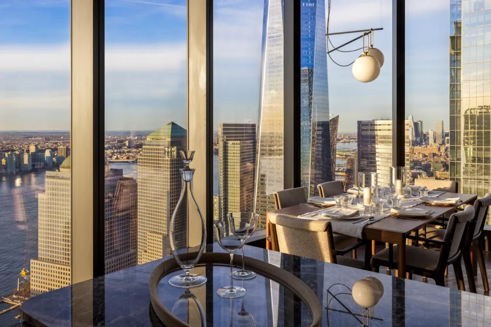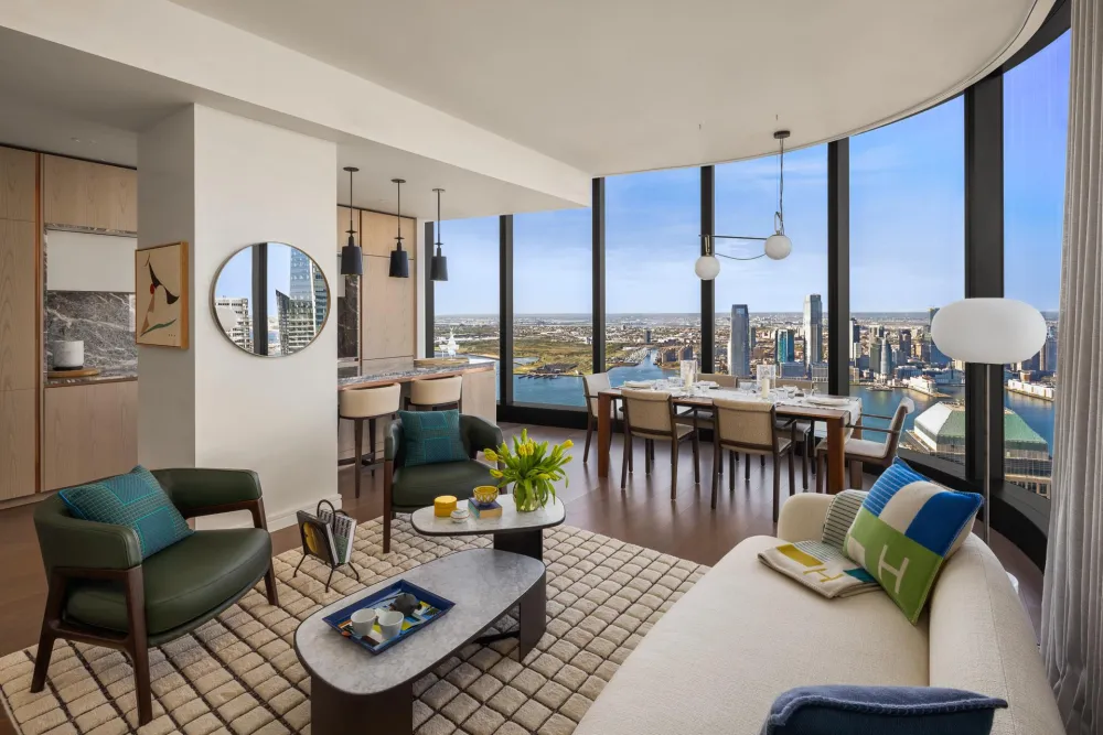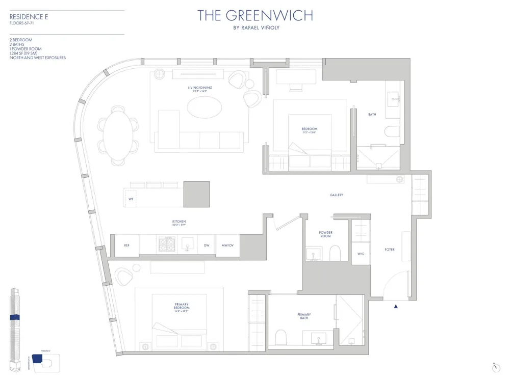 Welcome to Residence 69E at The Greenwich by Rafael Vinoly, a two bedroom, two and a half bathroom featuring magnificent northern and western exposures, and panoramic views of the Hudson River, The Freedom Tower, and the Perelman Performing Arts Center. Indulge in the breathtaking views through floor-to-ceiling windows with ceiling heights reaching over 10 feet, showcasing the expansive canvas of the city skyline and waterfront. At 1,284 square feet, this home offers thoughtfully designed living spaces, with interior finishes by esteemed design firm, MAWD.