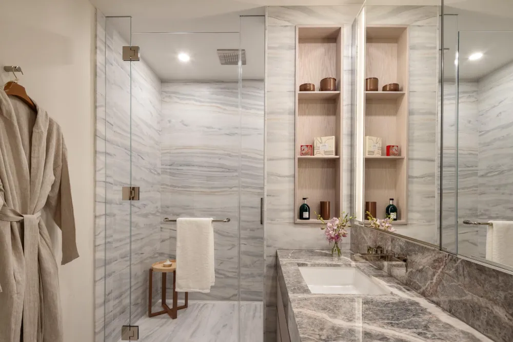 The oversized west facing primary bedroom features a wall of custom designed closets and custom designed primary bathroom featuring floor-to-ceiling Covelano marble, radiant heated floors, a custom wall-mounted vanity and faucet, and medicine cabinet with recessed lighting. A Miele washer and dryer and a climate control thermostat complete this home.