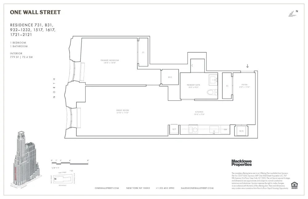 Move In Ready! Residence 932 is a 779 SF, spacious one bedroom layout within One Wall Street. Located in the North side of the building, this home offers natural light, and ample closet space. Custom kitchens and baths pair seamless technology with classic elegance. The Kitchen features Oceanwood marble... See more