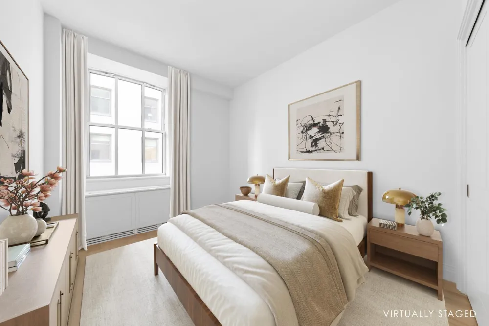 Warm stone primary bathrooms feature a stall shower with thermostatic controls. Mirrored medicine cabinets are integrated with LED lighting and Bianco Dolomite marble surround. The building’s one-of-a-kind residences maintain the integrity and character of the 1930s scale, a modern take to art deco detailing, and boast ceiling heights over ten feet throughout with wide-plank French Oak hardwood floors underfoot.
