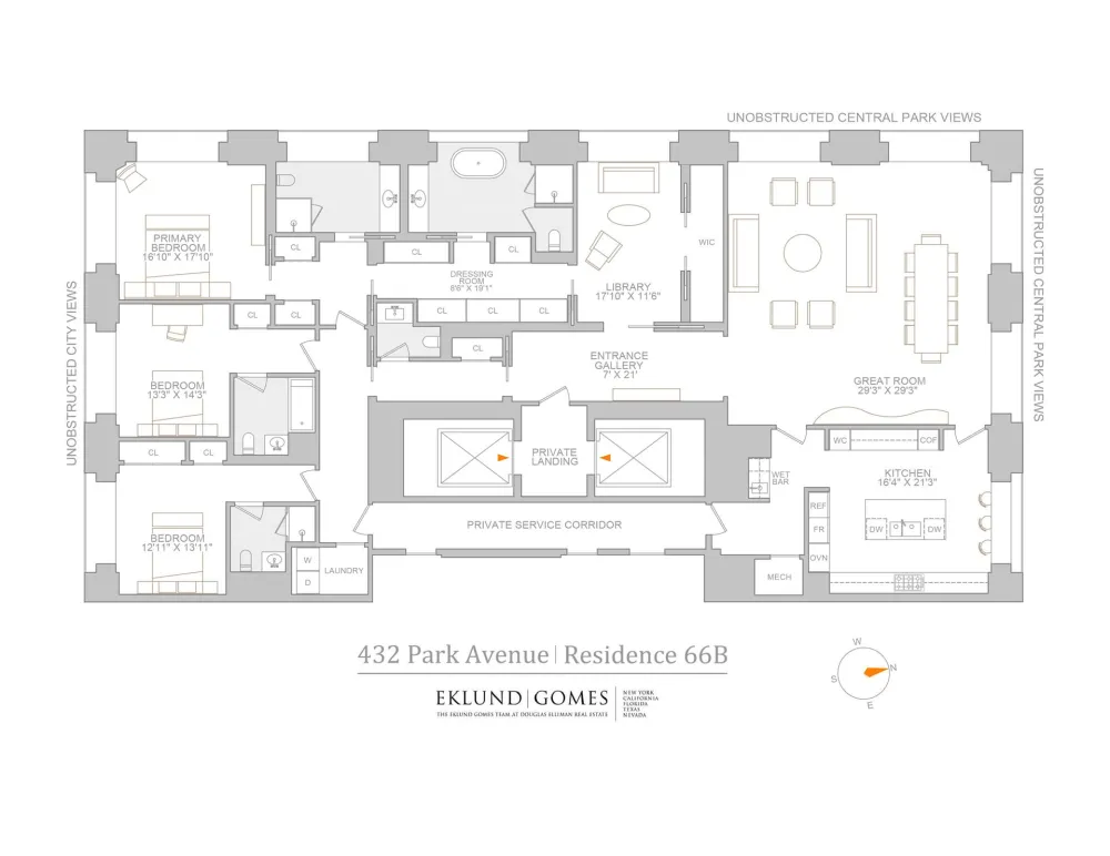 Occupying the entire western half of the 66th floor, this 4,019 square foot residence at the iconic 432 Park Avenue encapsulates fully unobstructed views of Central Park and the Manhattan skyline through its grand array of colossal, triple-paned 10 10 windows and 12.5' ceilings. The attraction to the B line on this floor is what truly sets this residence apart from other units in the building. While clearing the GM building and all subsequent surrounding towers, 66B boasts eye level, panoramic Central Park views which are unmatched throughout the entirety of the building. After being whisked up the high-speed elevators, one is welcomed to a private gallery landing which leads directly into the main entrance of the residence. Upon arrival, the apartment speaks for itself. Greeted by incomparable corner views of Central Park highlighted with abundant sunshine, this residence exemplifies the pinnacle of luxury living on Billionaire's row. The corner living and dining room of this residence is grand in size and boasts 12.5' ceilings. Off the living area is a generous chef's kitchen which features a built-in marble countertop overlooking Central Park. The kitchen is replete with Miele appliances including stove, gas cooktop, dishwasher, built-in coffee system, warming drawers, speed oven, dishwasher and wine storage. The magnificent master suite features two separate bathrooms and a walk-in-closet. Both master bathrooms are outfitted in Italian Statuario marble, heated floors, and boast soothing steam showers. One of the master bathrooms features a soaking tub with sunset views to the west overlooking the Hudson River and beyond. The master bedroom is positioned on the southwest corner of the building. The south facing, sun blasted windows from all of the bedrooms, frame a dramatic, unobstructed skyline view as far at the eye can see. The subsequent two bedrooms also each have sumptuous en-suite marble bathrooms. The residence comes full circle with the bedroom wing connecting to the foyer, powder bathroom and private laundry room.