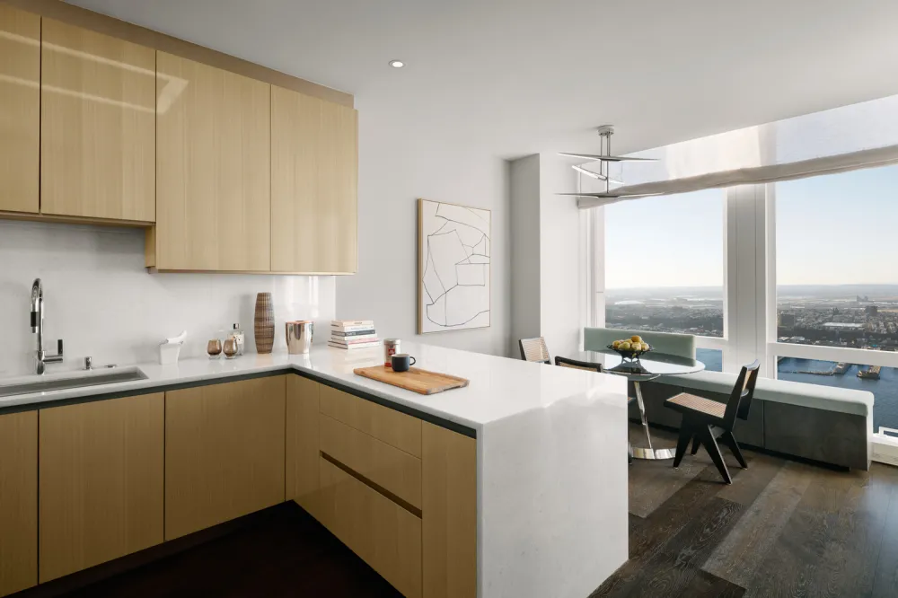 Residents will enjoy signing privileges and other benefits, such as preferred reservations and seating, catering, and in-residence dining. In addition, residents will have access to 22,000 square feet of luxurious private amenities including a residents-only fitness center with a stretching and yoga studio, serene meditation room, business center and boardroom, elegant cocktail lounge and bar, screening room with wet bar, golf simulator lounge and a grand terrace and private dining room with catering services overlooking the Hudson River with stunning sunset views.