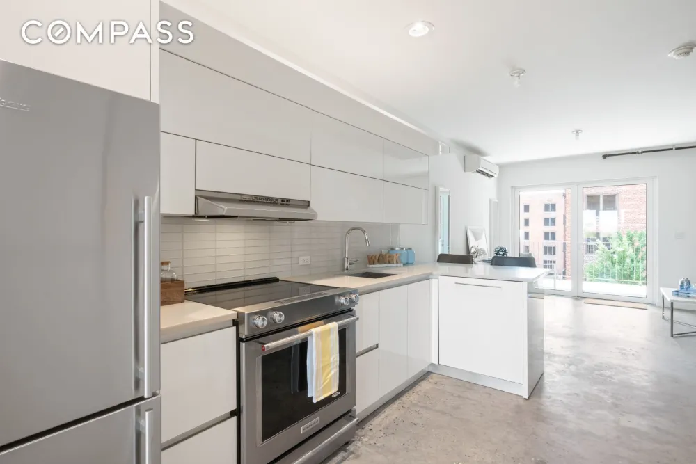 This exquisite 1BR 1BA home offers a luxurious living experience with a private keyed elevator, providing direct access to your floor. A modern and elegant residence in the heart of Prospect Lefferts Gardens. Step inside to discover a thoughtfully designed space featuring floor-to-ceiling windows that flood the home with natural light and offer stunning views of the surrounding cityscape. The open kitchen, equipped with Bosch and Blomberg appliances, Caesarstone counters, and a breakfast bar, is a chef’s dream, perfect for culinary creations and entertaining guests.