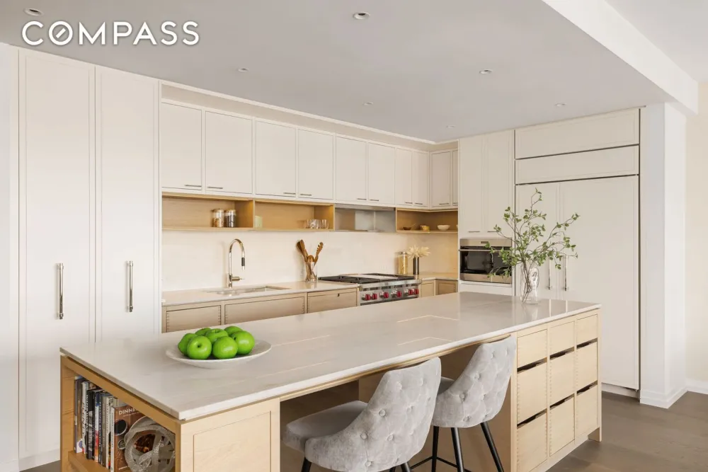 The spacious corner living room is accentuated by casement windows, providing stunning open east and south city views. The beautifully designed open kitchen is highlighted by Brazilian desert quartzite countertops with white marble backsplash, open shelving, and solid white oak cabinets with exposed dovetail joinery and elegant inlay details. The kitchen is equipped with top-of-the-line stainless steel appliances, including a vented Wolf speed oven and gas range with grill, Sub-Zero refrigerator, wine fridge, Cove dishwasher, and a deep stainless steel sink with an InSinkErator. The large island offers ample counter space, additional storage, and seating for at least four.