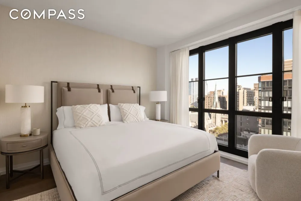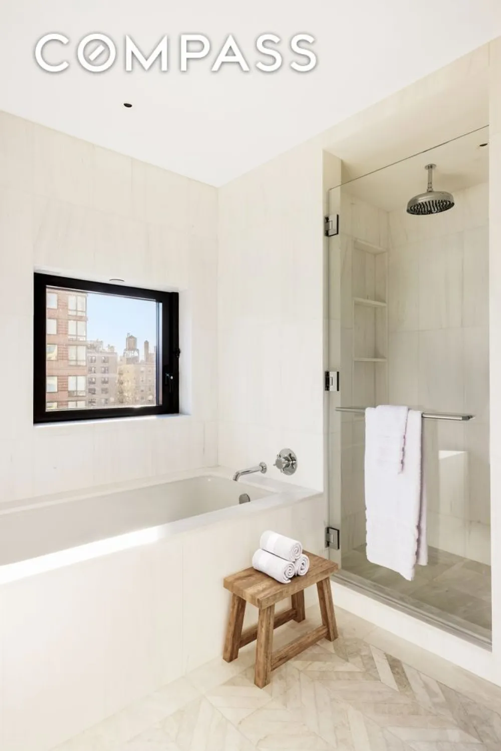 The second bedroom also benefits from eastern light and has a Calacatta marble en-suite bath, complete with marble mosaic floors, Waterworks tub, white oak vanity with a stone-glass countertop, Hansgrohe fixtures, and a wall-hung Toto toilet.