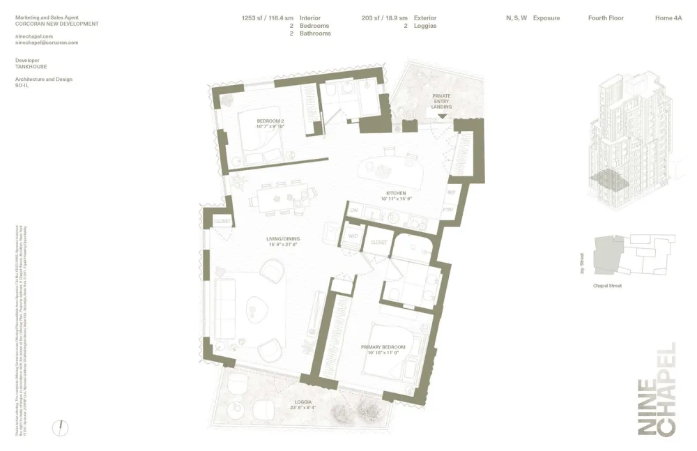Arrival into Nine Chapel is via a landscaped walkway into a double-height lobby. The residences each have a dedicated, covered stoop-like entry landing, a functional extension of the homes" interiors. The innovative layouts provide each home the benefit of a corner unit, with every residence offering at least two exposures and abundant natural light through large picture windows.