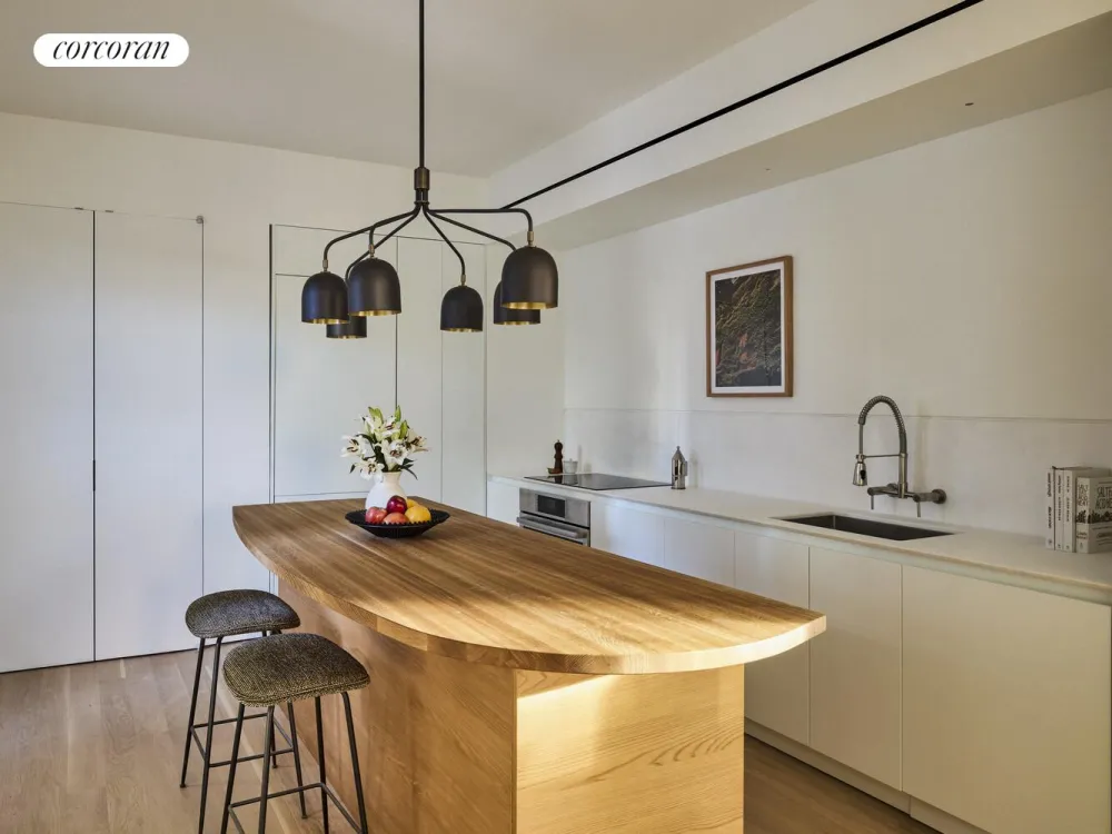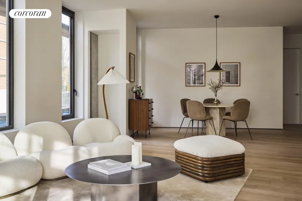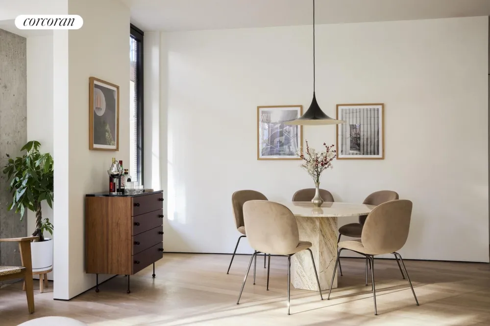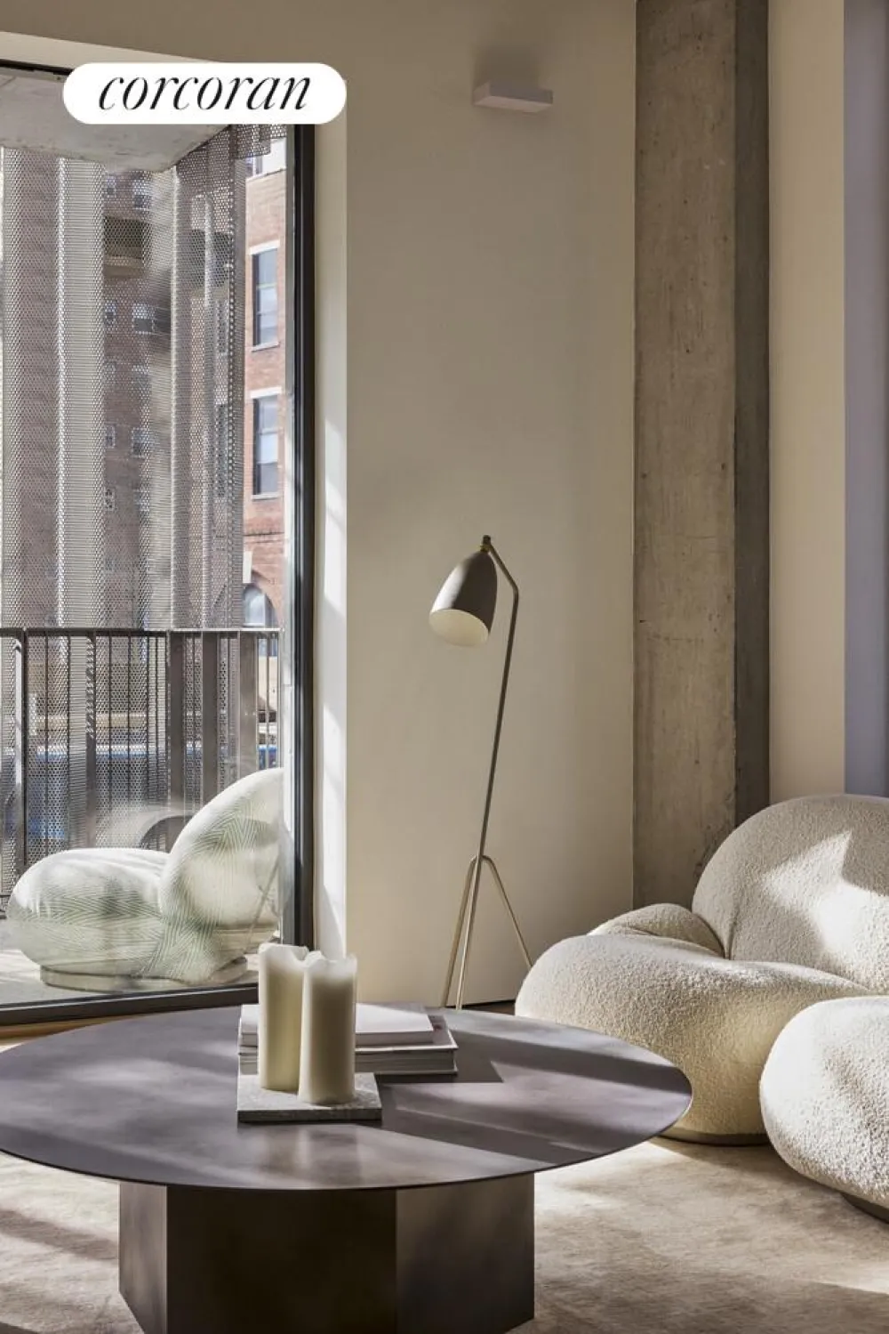 Residence 4A is a 1,253 sf corner two bedroom, two bath home offering north, south and west exposures, a private entry landing, and covered loggia accessible from both the living room and primary bedroom looking out toward the neighboring cathedral. The loggia is framed by a beautiful perforated screen which, allows light to filter in but provides added privacy and weather protection making it a true extension of the interior. The expansive great room allows for a large dining table in the windowed dining area, and generous corner living area with light streaming in from each exposure. The kitchen is the focal point, with its gorgeous organically shaped island functioning as an additional gathering space. The primary bedroom offers a full wall of closets, and a stunning en-suite bathroom with dual sinks and a shower. The secondary bedroom has corner exposures, and a windowed hall bath with a tub and white glass mosaic tile.