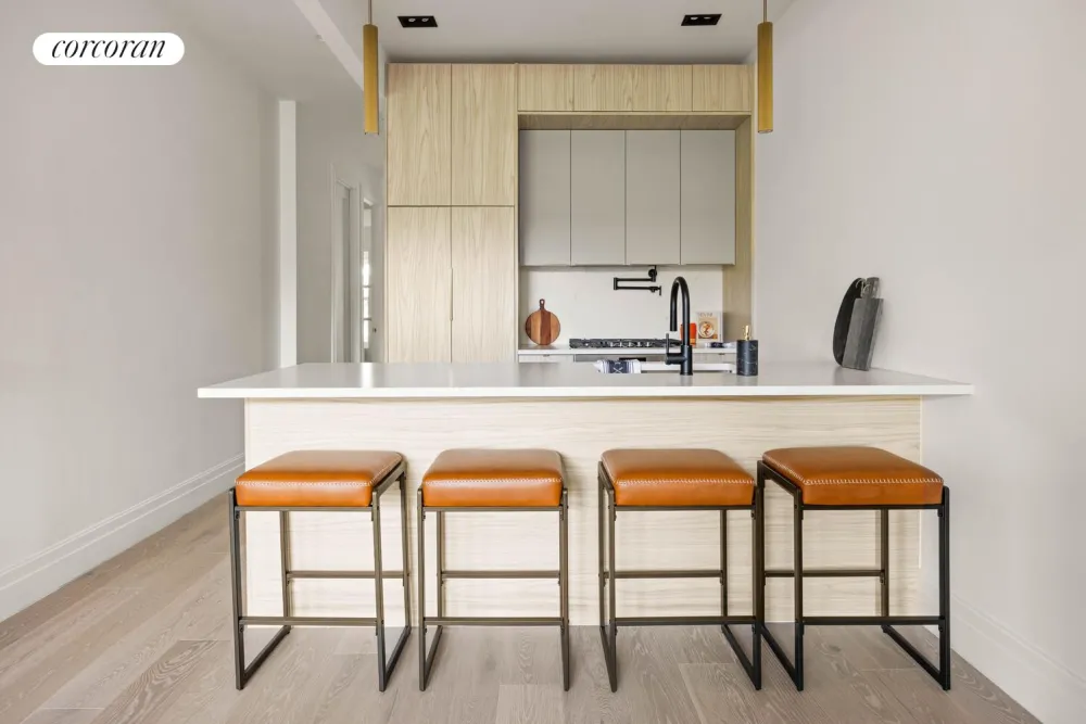 Upon entering the expansive living room, you'll be greeted by a spacious living room with dining alcove, complemented by an original fireplace that exudes timeless elegance. Wide plank oak flooring speak to the natural aesthetic, while the sleek galley kitchen is outfitted with top-of-the-line appliances, including a paneled Fisher & Paykel refrigerator, Bosch five-burner gas stove, built-in drawer microwave, and dishwasher-all seamlessly blended into the kitchen's refined design.