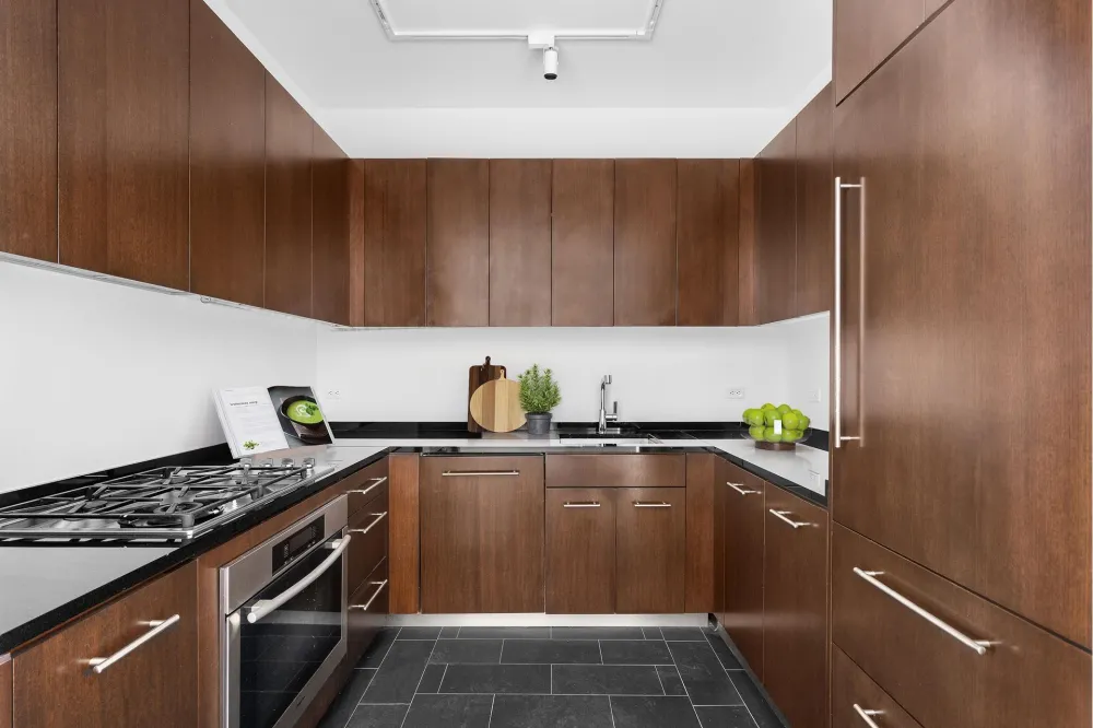 The kitchen showcases top-of-the-line Miele appliances, perfect for culinary enthusiasts. Its elegant black granite countertops and backsplashes elegantly complement the magnificent mahogany cabinetry. All cabinets are equipped with stainless-steel bar-pull hardware, featuring seamless self-closing mechanisms, including the dishwasher.